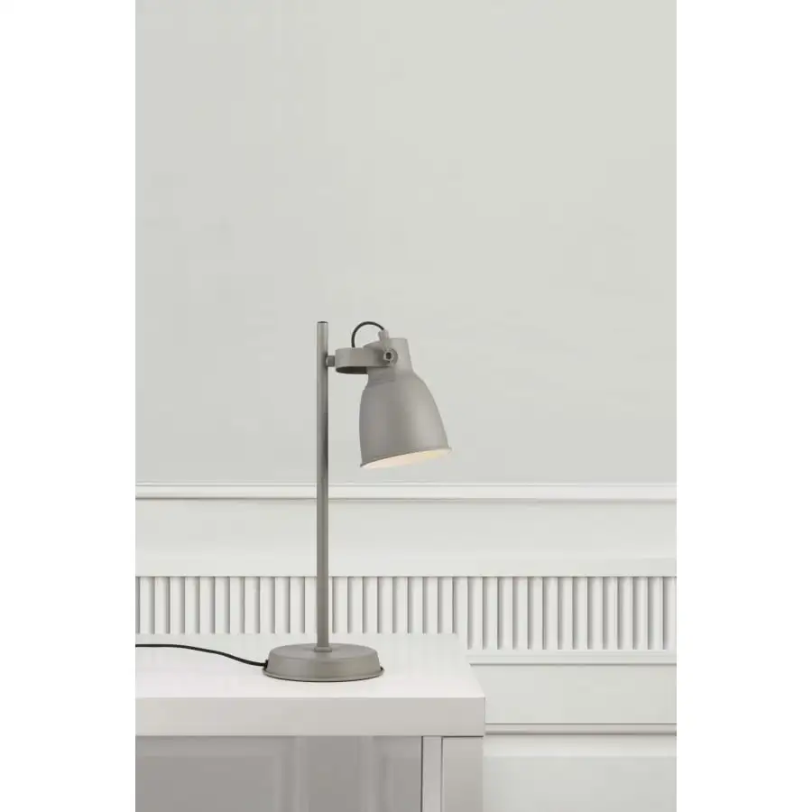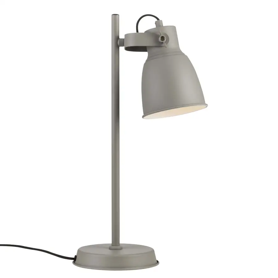 Bordslampa i industriell stil av grov yta i metall. Ljuset lyser inte bara nedåt från skärm utan även åt sidorna genom öppningarna i mitten av skärmarnas justerskruvar. Höjden på bordslampan är 47 cm, skärmens diameter är 12,5 cm och diametern på sockeln är 16,5 cm.