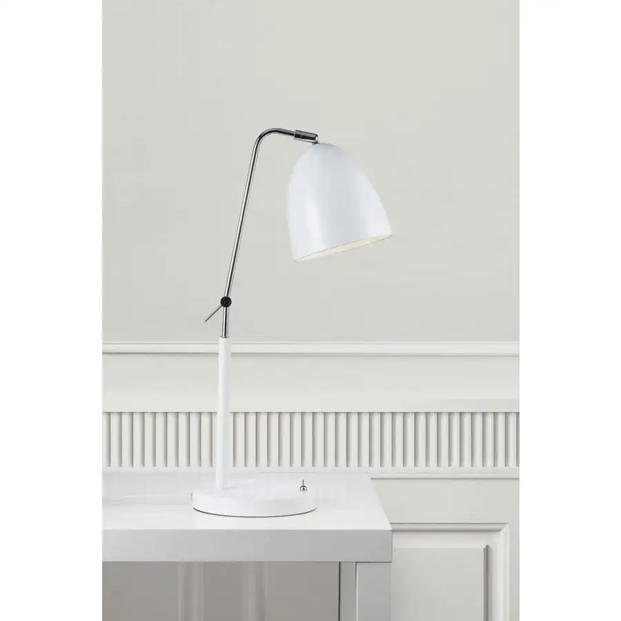 Tidlös bordslampa i blank krom och matt metall. Den övre delen av skaftet är justerbar, och skärmen kan vändas i sidled samt upp och ner.