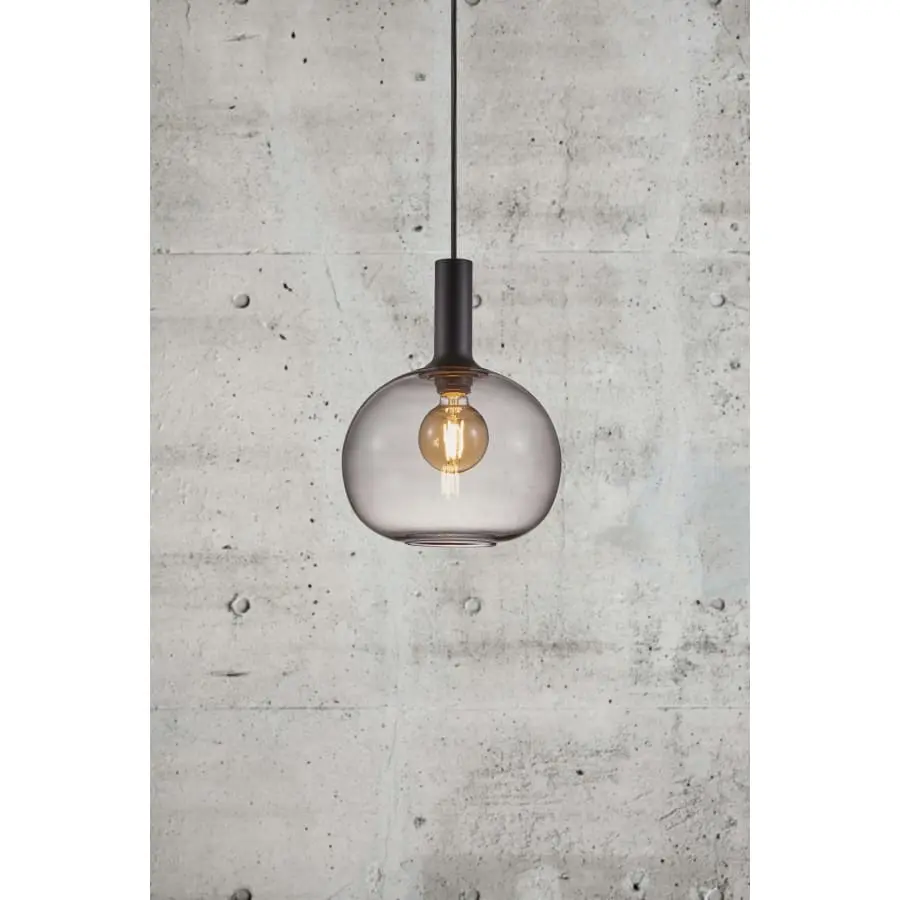 En elegant och trendig hänglampa vars rökgrå glasskärm gör att ljuset lyser mjukt och varmt. Lampans höjd är 33 cm och diametern är 25 cm.