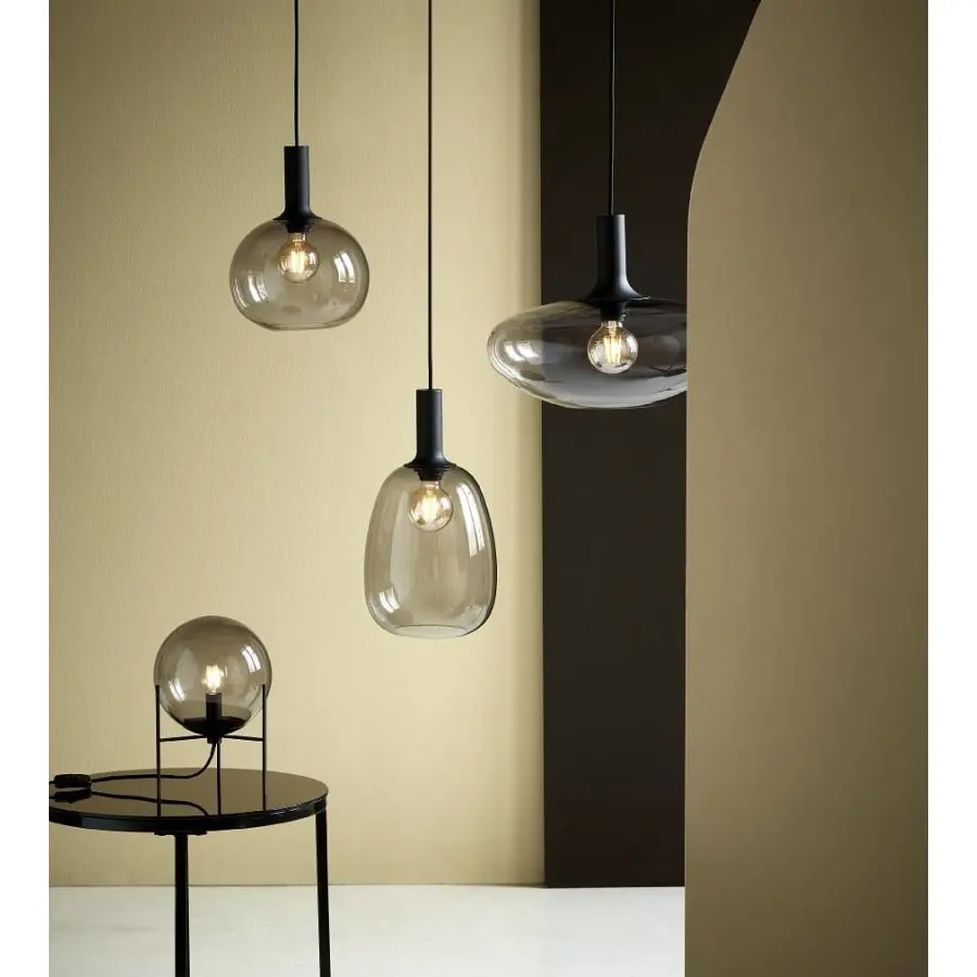 An elegant and trendy hanging lamp whose smoke gray glass shade makes the light glow soft and warm. The height of the lamp is 33 cm and the diameter is 25 cm.