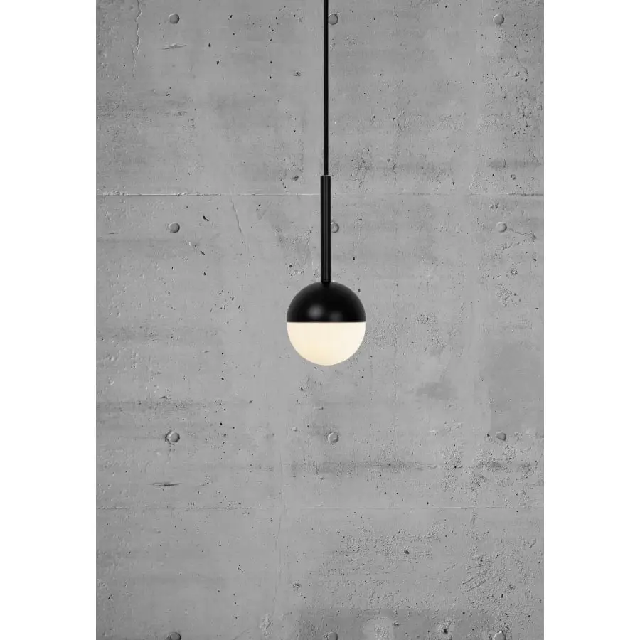 En vacker hänglampa i art déco-stil gjord av metall och opalvitt glas. Lampans diameter är 10 cm och höjden är 23 cm. Takkoppens diameter är 12 cm och höjden är 2,5 cm. Längden på hängsnöret är 200 cm. Fast installation, sockerblocksanslutning.