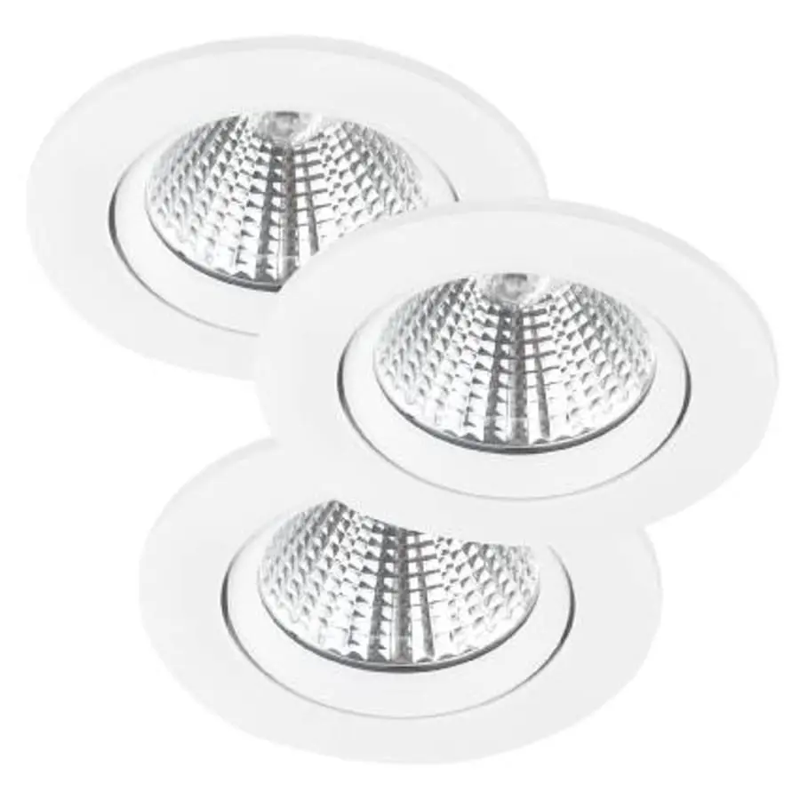 3-piece LED downlight set in brushed steel. The light shade is warm white (2700K). The light source is directional and the Downlights are dimmable. The diameter of the downlight is 8.5 cm and the height is 5.4 cm.