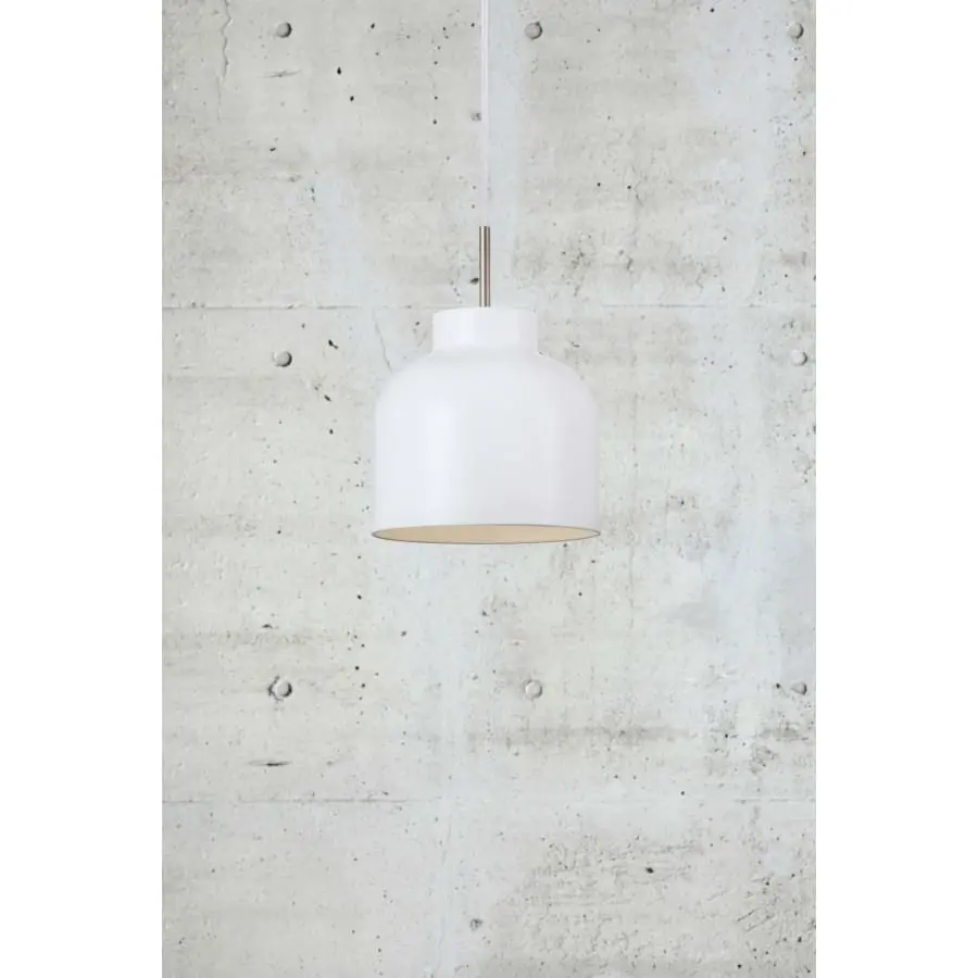 Modern och stilren matt vit pendel med en mässingsdetalj. Det finns små hål i den övre delen av skuggan, varifrån ljuset också lyser uppåt. Lampans diameter är 23 cm och höjden är 22 cm.