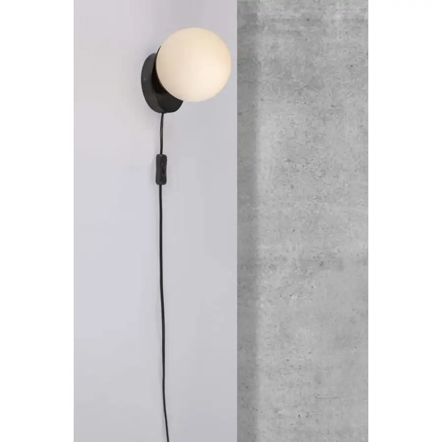 A stylish wall lamp with a black metal frame and an opal white glass dome. The beautiful glass dome lets in soft and pleasant light. The height of the lamp is 17 cm, the depth is 16.5 cm and the diameter of the glass dome is 13 cm. The wall bracket is 12 cm in diameter.