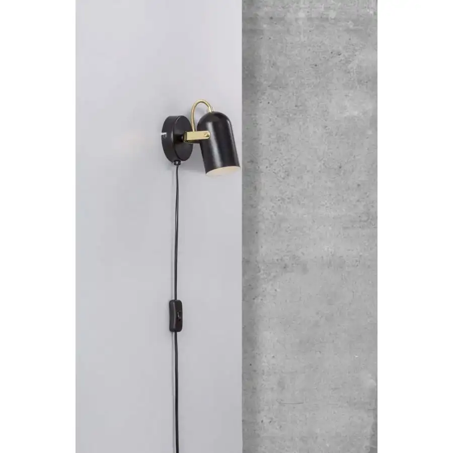 Snygg vägglampa i svart och mässingsfärgad metall. Lampans höjd är 17,5 cm och djupet är 9 cm. Skärmen har en diameter på 6,6 cm och är justerbar (150°). Väggfästet är 9 cm i diameter.