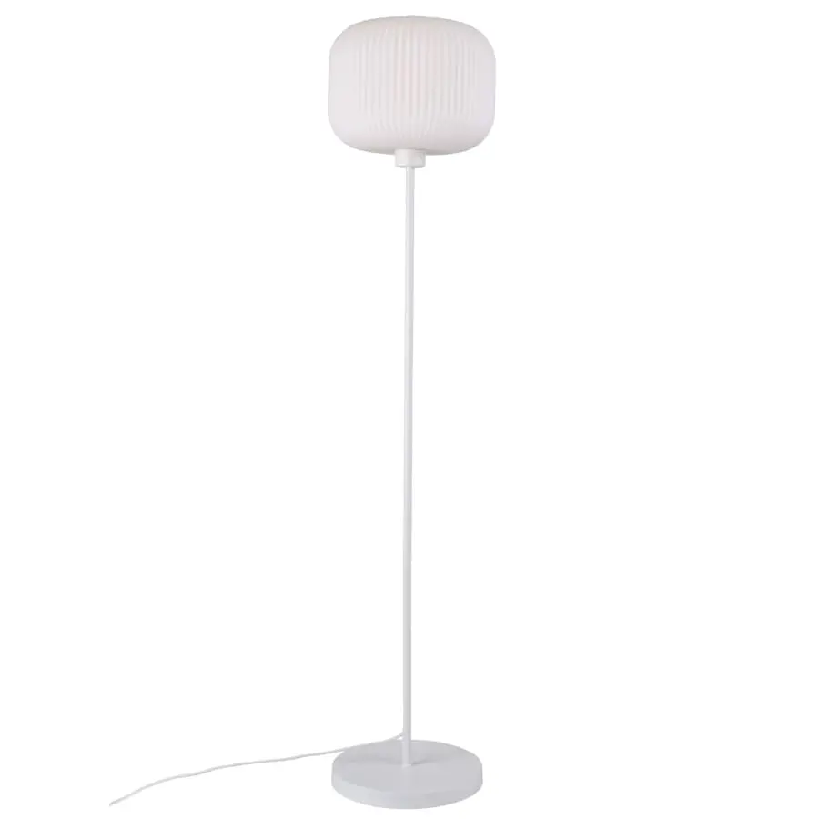 En vacker golvlampa av vit metall och räfflat opalvitt glas, som skapar ett mjukt, stämningsfullt ljus i rummet. Lampans höjd är 139,4 cm och diametern på skärmen är 30 cm. Basen är 28 cm i diameter.