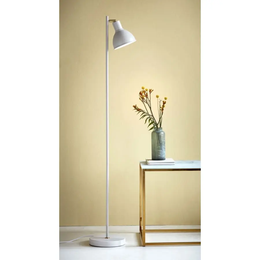 Golvlampa i industristil gjord av grov yta av metall och mässing. Lampans höjd är 145 cm och skärmdiametern är 15 cm. Basen är 23 cm i diameter.