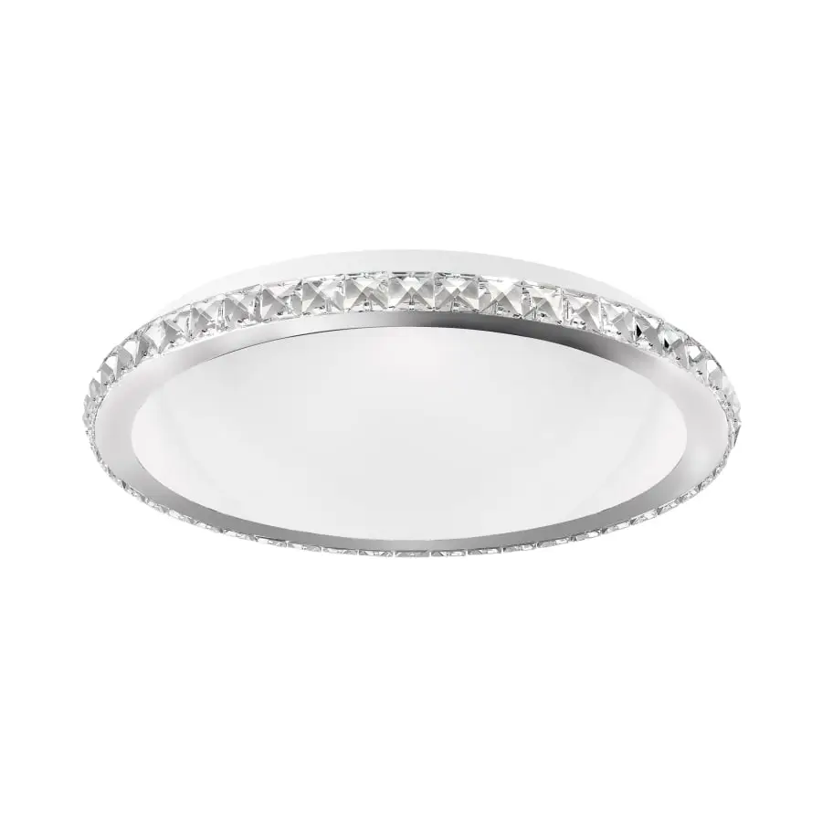 A beautiful ceiling lamp with white glass and K9 crystals on the edge, which give a beautiful sparkle to the room. The diameter is 50.5 cm and the height is 9 cm. Four E27 socket bulbs can be installed in the lamp. The product is installed in the ceiling box with screws.
