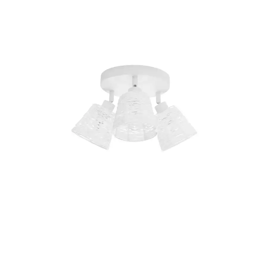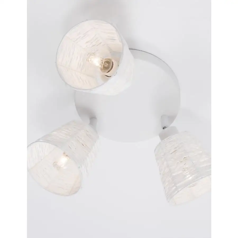 Vit spotlampa med vackra lampskärmar som är härdad fläta. Från mellan flätor i skuggan blinkar ljuset in i rummet och skapar ett atmosfäriskt ljus. Tack vare skarvarna kan kupolerna vändas till många olika positioner. Ljuseffekt 3xE14, glödlampor ingår ej i paketet. Diametern på bottenplattan är 19cm, diametern på lampan är större när kupolerna vrids till yttersta läget. Lampans höjd 17,7 cm. Fästs i takboxen med skruvar.