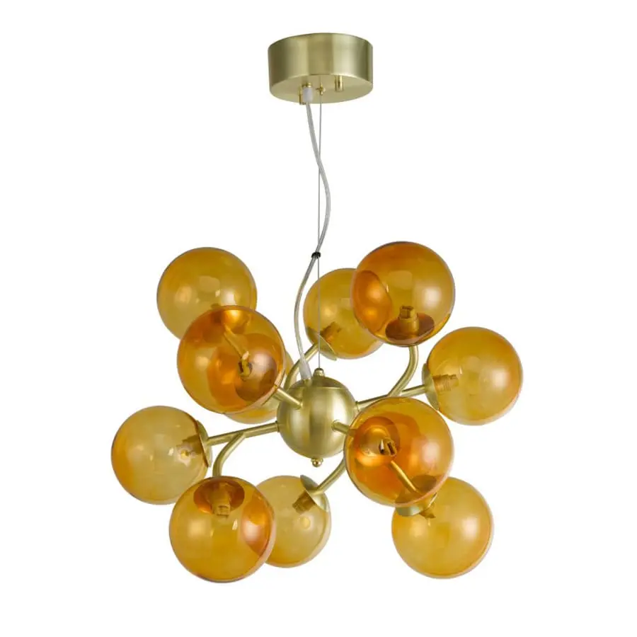 Height 42 cm, Diameter 50 cm, Material metal, Color brushed brass/amber glasses, 12xG9 lamp base Max 3W LED, IP20, 110 cm clear cord, sugar cube connection
