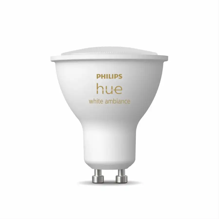 This package contains one Philips Hue White ambiance LED bulb with a 4.3 W GU10 base (equivalent to a 35 W traditional light bulb). The light output of the lamp can be dimmed and the color temperature can be adjusted between cool and warm white. Philips Hue takes smart home integration to a new level. This comprehensive ecosystem enables the use of smart lighting in all areas of the home. Hue helps you wake up refreshed in the morning and fall asleep relaxed at night.