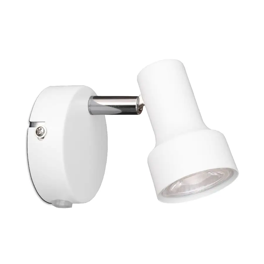 Vit vägglampa med sirligt och minimalistiskt formspråk. Förkromad arm. Vit brytarförsedd PVC-sladd. Förträfflig läslampa till sänggaveln.