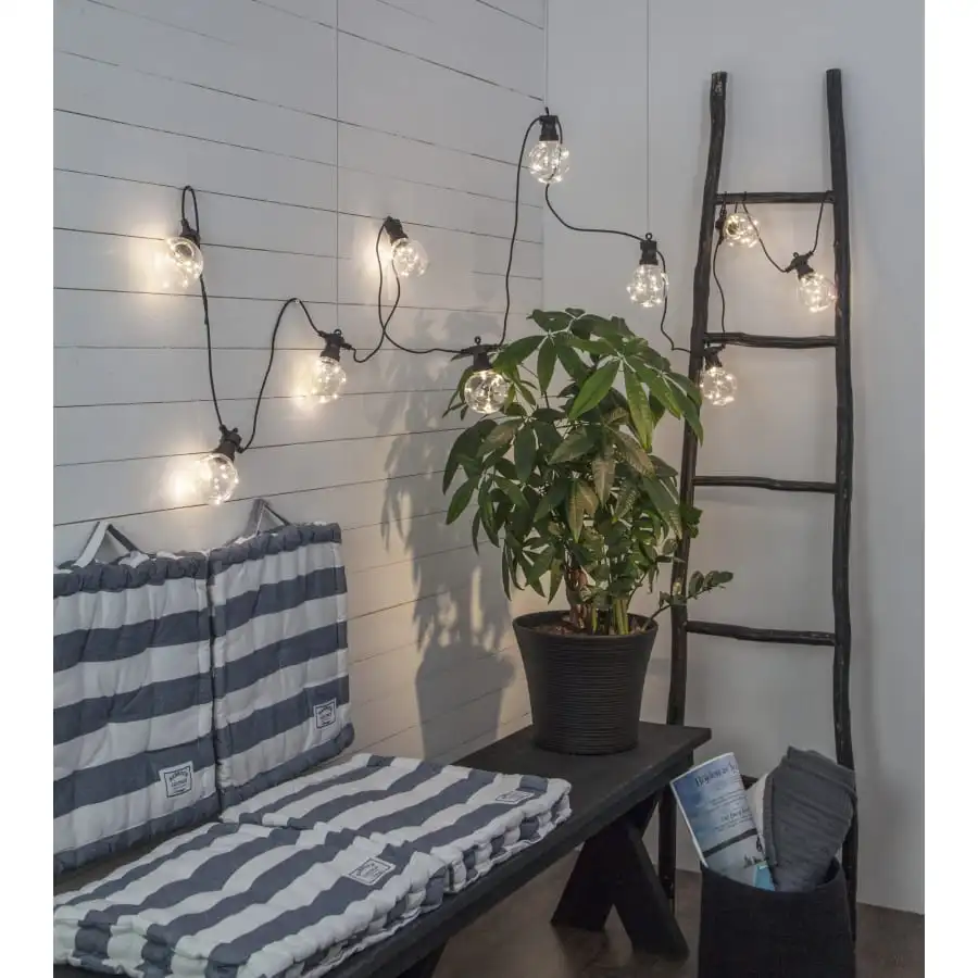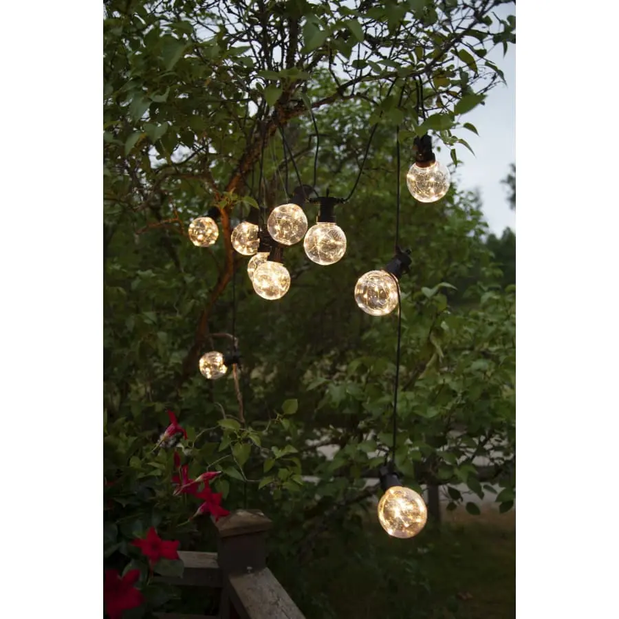 – The light set has ten clear balls with a diameter of 8 cm, each of which contains 10 warm white Dew Drop LEDs.