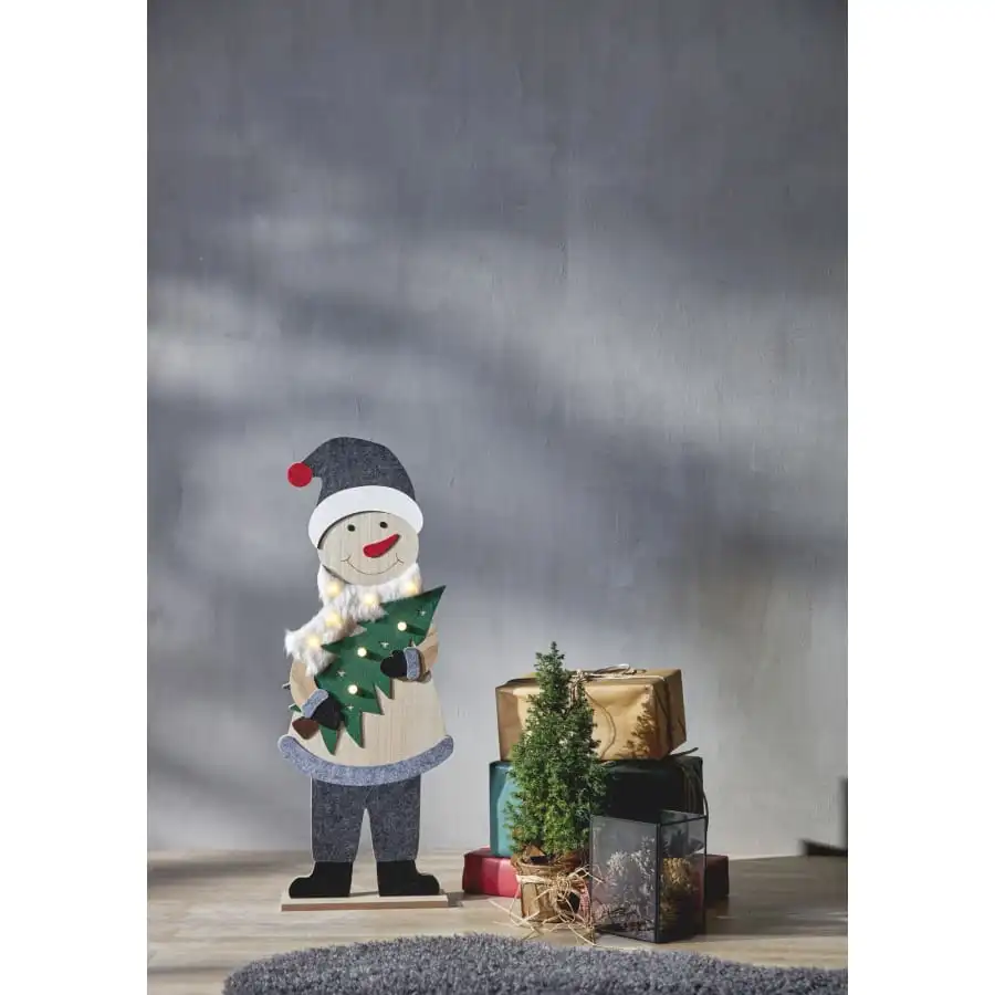 80 cm hög, iögonfallande snögubbedekoration för inomhusbruk. Dekorationen passar till exempel till ett barnrum, bredvid granen eller nära entrén för att välkomna gäster. Snögubben är gjord av MDF-skiva, och detaljen är textildekorationer. Snögubbsdekorationen har 8 fasta LED-lampor som skapar en varm julstämning