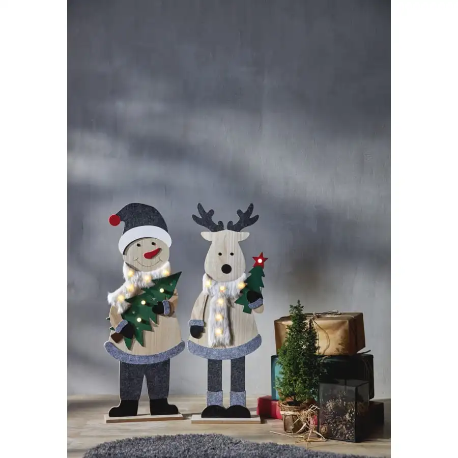 80 cm high, eye-catching snowman decoration for indoor use. The decoration is suitable, for example, for a children’s room, next to the Christmas tree or near the entrance to welcome guests. The snowman is made of MDF board, and the detail is textile decorations. The snowman decoration has 8 fixed LED lamps that create a warm Christmas atmosphere