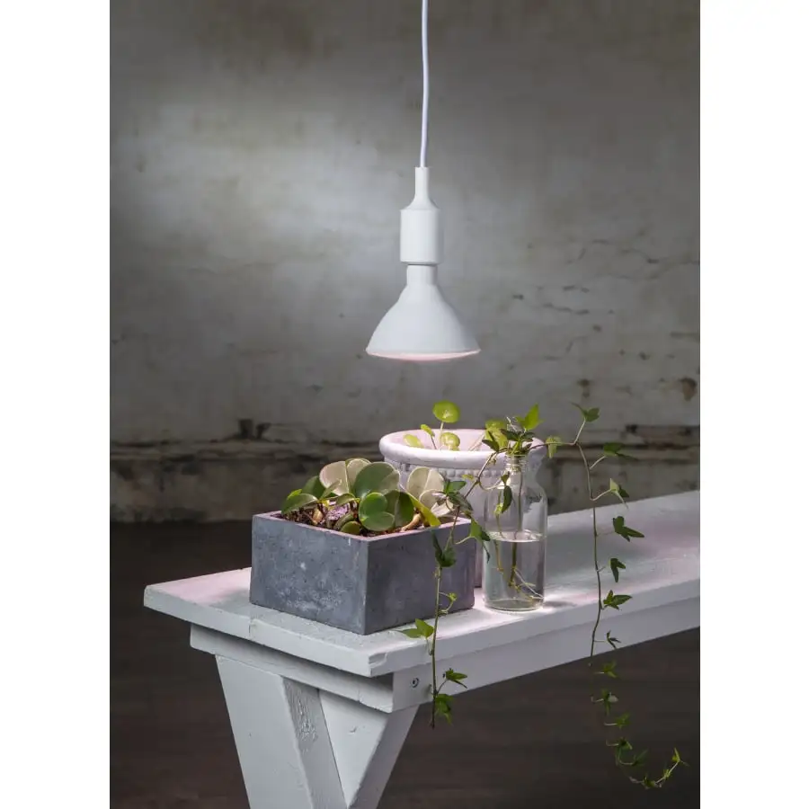 Energy-efficient LED plant lamp with E27 base. The lamp produces light with blue and red wavelengths, which accelerate plant growth and increase flowering.
