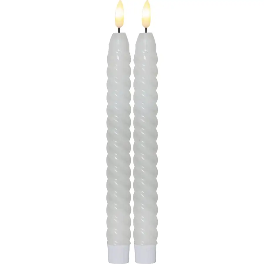 A spiral antique candle made of wax with a real-looking LED flame. The candle illuminates with a warm white light. The package contains two candles suitable for indoor use.