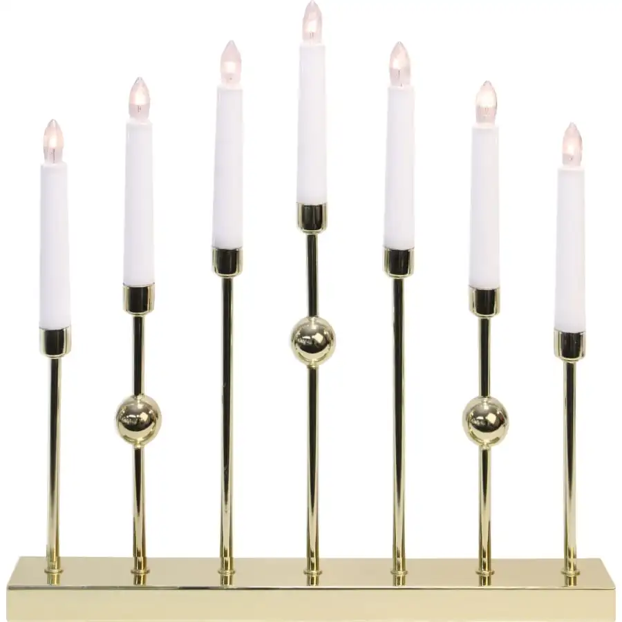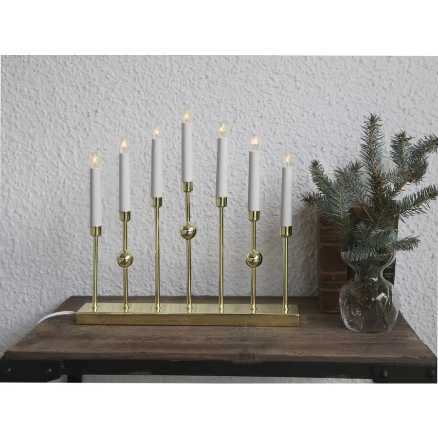 En snygg 7-grenad metallljusstake med en höjd på 37 cm, en bredd på 37 cm och ett djup på 6 cm. Ljuset har utbytbara glödlampor med E10-sockel. Nätsladden med strömbrytare är 180 cm lång.