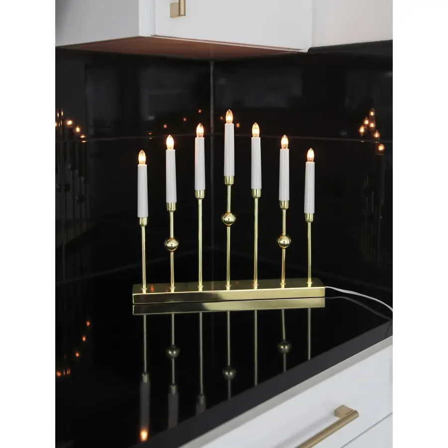 A stylish 7-branched metal candlestick with a height of 37 cm, a width of 37 cm and a depth of 6 cm. The candle has replaceable bulbs with E10 sockets. The power cord with a switch is 180 cm long.