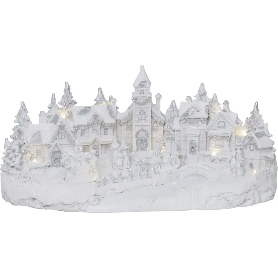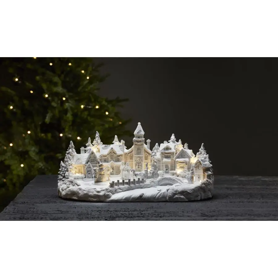 En vit dekorativ by med t.ex. kyrka, hus och fina detaljer som en snurrande snögubbe. Dekorationen är 45 cm bred, 21 cm hög och 23 cm djup och har 11 varmvita LED-lampor. För inomhusbruk.