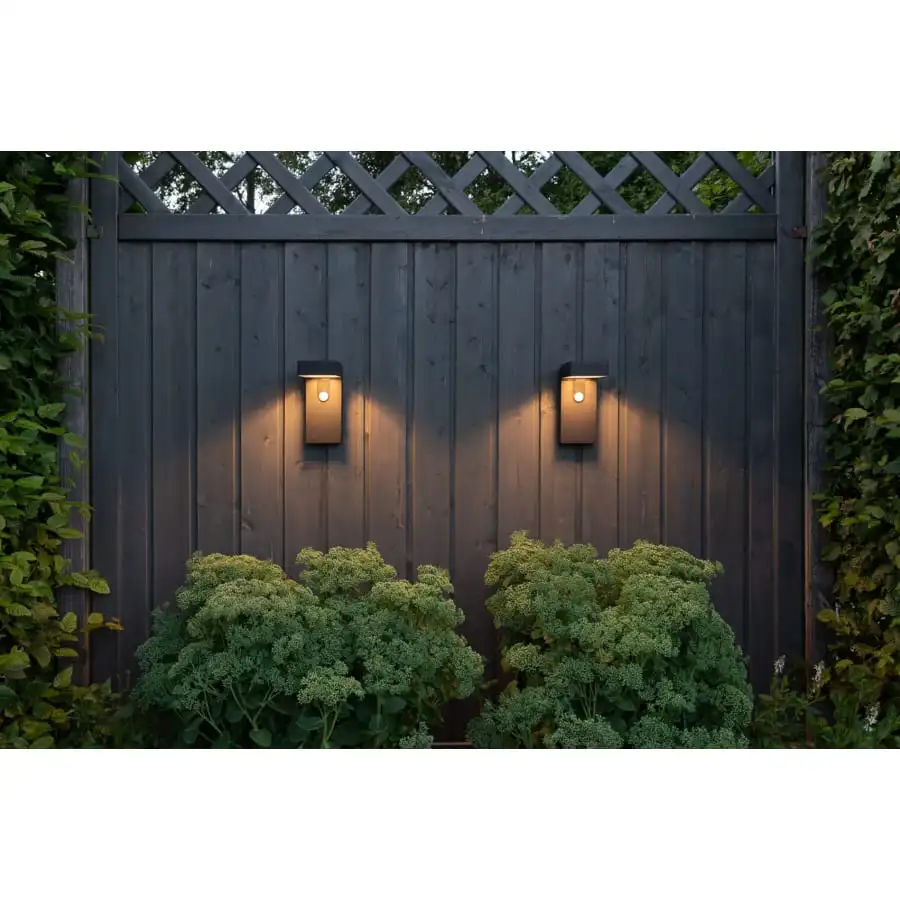 A solar-powered wall lamp with a motion and twilight sensor. The motion sensor turns on a 300-lumen light for 25 seconds when it detects movement, otherwise the light output is 30 lumens in low light. The operating radius of the motion sensor is 4-6 meters and 90 degrees. The lamp has a warm white light.