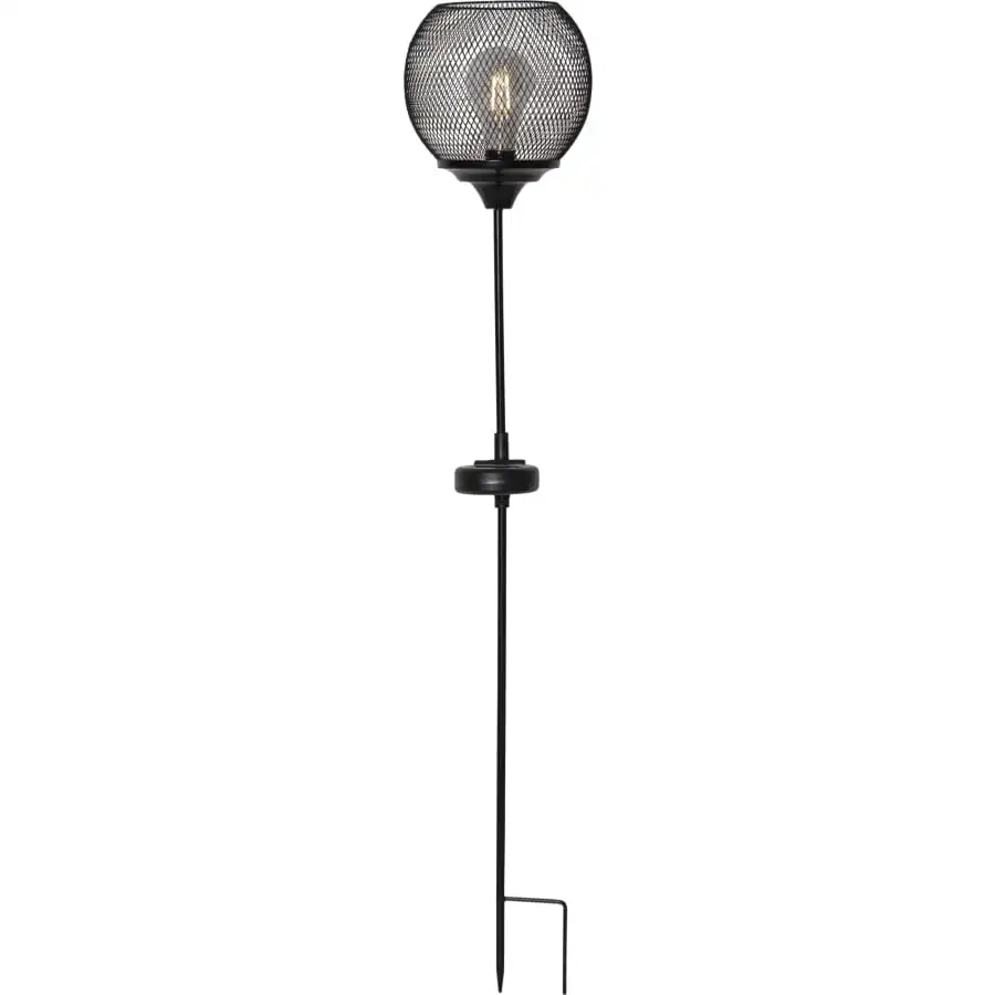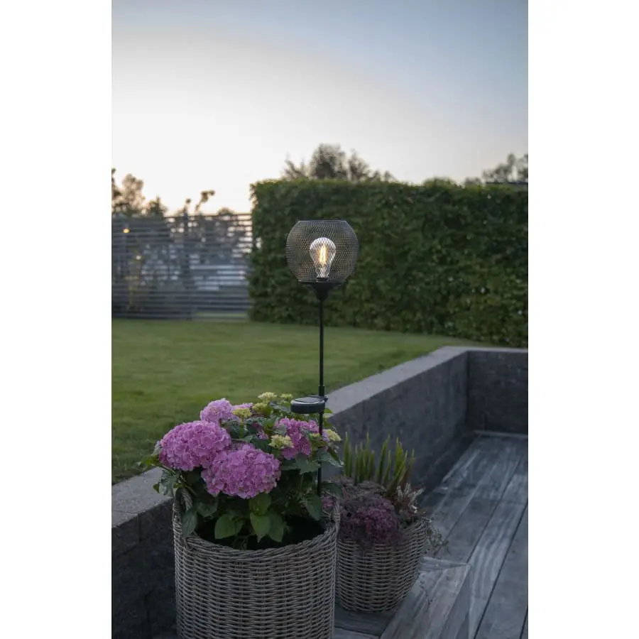 En solcellsdriven trädgårdslampa som tänder ett varmvitt ljus efter skymningen. Lampan är gjord av metall och är lätt att sätta på plats
