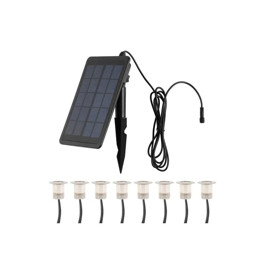 High quality set of eight terrace lamps. The luminaires are charged with the included solar panel or alternatively the charging can be done from the USB connector. The solar panel has a twilight sensor that turns on the lights when it gets dark and the lights turn off automatically after 7 hours of use. Three different light outputs can be selected from the solar panel switch. The solar panel is equipped with a ground spike. The cable lengths between the luminaires are 1.6 m and the cable between the first luminaire and the solar panel is 2.8 m. Solar panel: polycrystalline 3 W 5 V 600 mAh. Battery: 3.7 V 2000mAh Li. Enclosure class IP68. Light output max 25 lm/luminaire. Power: 3 W/set. Size of solar panel: 13 cmx19,5 cmx0,6 cm. Color temperature 4000 K (bright white). Warranty 12 months.